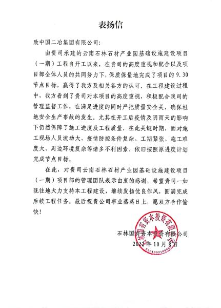 10月8日,中國二冶路橋分公司云南石林石材產(chǎn)業(yè)園項目同時收到來自石林國有資本投資有限公司和石林縣質(zhì)量安全消防監(jiān)督管理站發(fā)來的表揚信,對中國二冶石林項目部管理團隊保質(zhì)保量完成節(jié)點目標(biāo)及安全任務(wù)目標(biāo)表示高度贊揚。