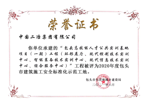 近日,從包頭市安監(jiān)站獲悉,中國(guó)二冶城建分公司實(shí)訓(xùn)基地項(xiàng)目被內(nèi)蒙古自治區(qū)包頭市住房和城鄉(xiāng)建設(shè)局評(píng)為2020年度包頭市建筑施工安全標(biāo)準(zhǔn)化示范工地。