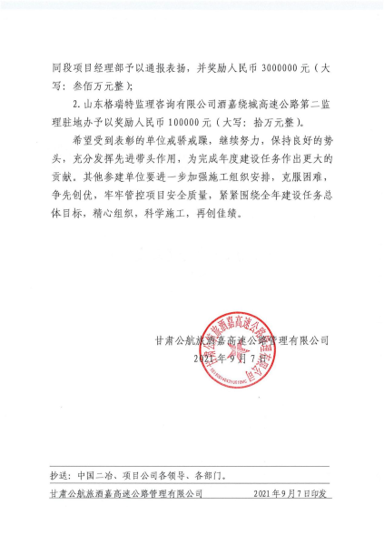9月7日,甘肅公航旅酒嘉高速公路管理有限公司公發(fā)出通報,對在安全、質(zhì)量、進(jìn)度、廉政等方面取得優(yōu)異成績的施工單位進(jìn)行表彰,中國二冶酒嘉項目部榮登榜首,獲得獎金300萬元。